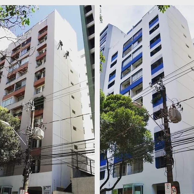 Executamos serviços de restauração, conservação e manutenção de fachadas, utilizando técnicas de acesso por cordas, o que proporciona maior eficiência operacional, redução de custos e mínima interferência na rotina do edifício.